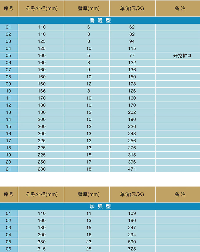 韌性好,具有優(yōu)良的抗地層沉降及抗震性能。常用管材分為普通型和加強(qiáng)型。普通型適用于開挖鋪設(shè)施工和非開挖穿越施工埋深小于4米的工程;加強(qiáng)型用于非開挖穿越施工埋深大于4米的工程。